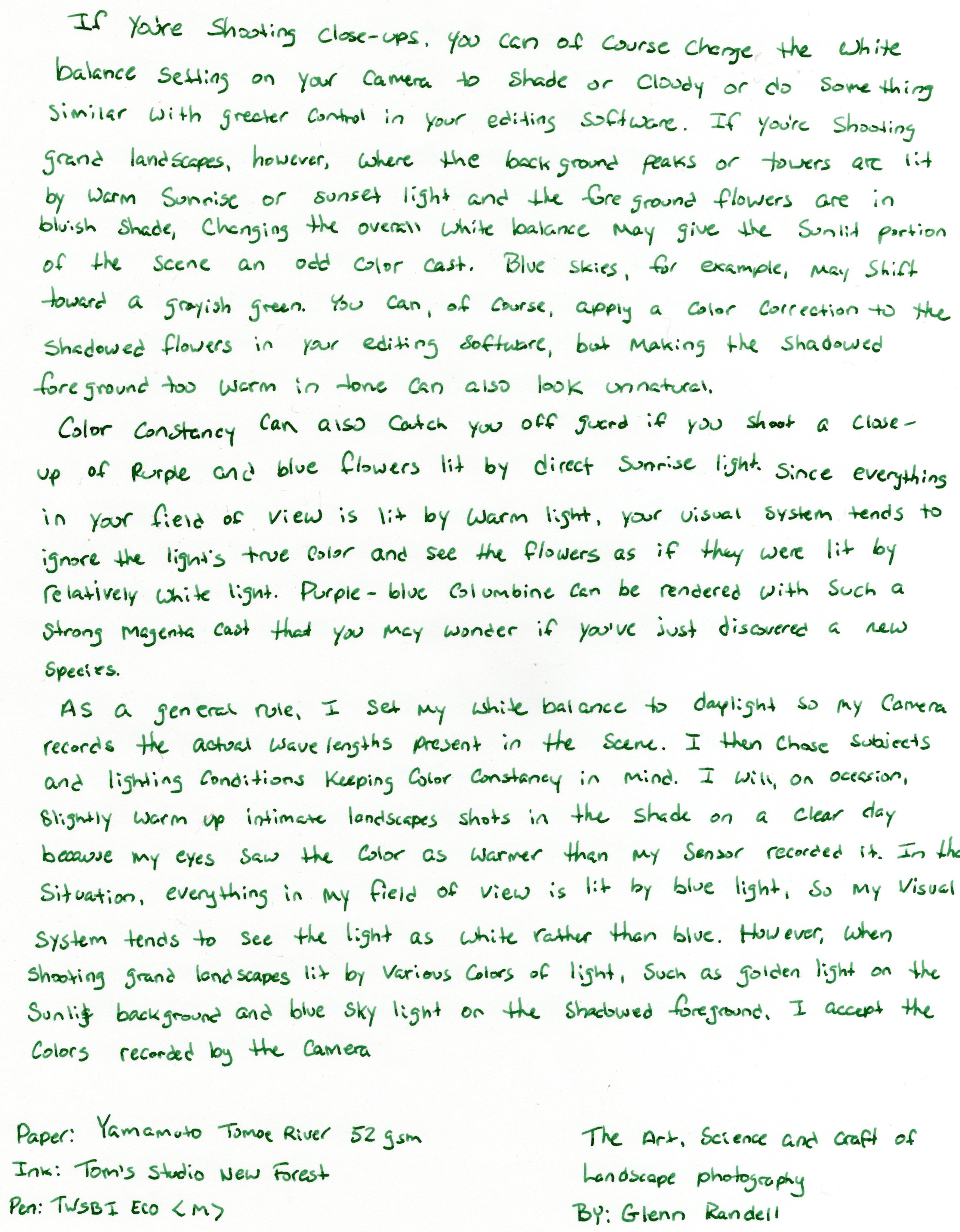 In the larger writing samples, shading is visable to varying degrees, even if the scans didn’t pick it up. There is shading on the Tomoe River and shading is very visable on the Iroful. And on the Yu-Sari the shading is visable and the sheen is visable around the edges, again the scans didn’t pick that up, but it’s there! The flow of the ink is wet, so wet that I didn’t experience the typical drag on the Iroful. Everything was nice a flowy on each of the papers. I’ve really enjoyed using this ink and think it’s perfect going into the summer season.
